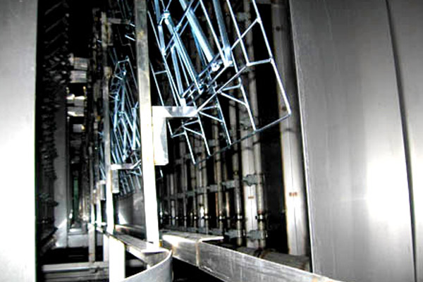前處理設(shè)備根據(jù)工件形狀和生產(chǎn)量不同,主要結(jié)構(gòu)形式有浸漬式、隧道通過噴淋式: